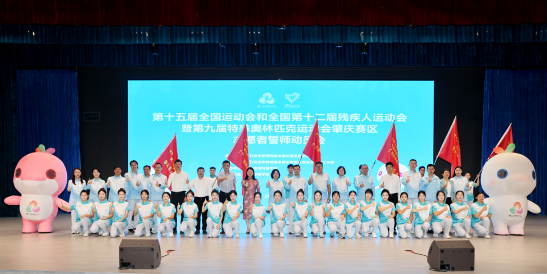 在授旗环节,市执委会志愿者工作部相关成员单位负责人分别为肇庆学院、肇庆医学院、广东理工学院、广州应用科技学院、广州华商学院以及城市志愿服务队授旗。志愿者代表挥舞旗帜,现场掌声雷动。随后,全体志愿者在领誓人带领下庄严宣誓:“为湾区添彩,为祖国争光!为你,更精彩!”誓言铿锵,展现了志愿者们服务赛会的坚定信念与昂扬斗志。