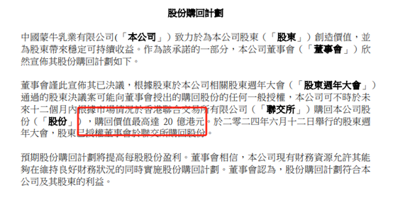 2024年8月,蒙牛乳业公告股份购回计划,公司于未来十二个月内根据市场情况购回本公司股份,购回价值最高达20亿港元。预期股份购回计划将提高每股股份盈利。